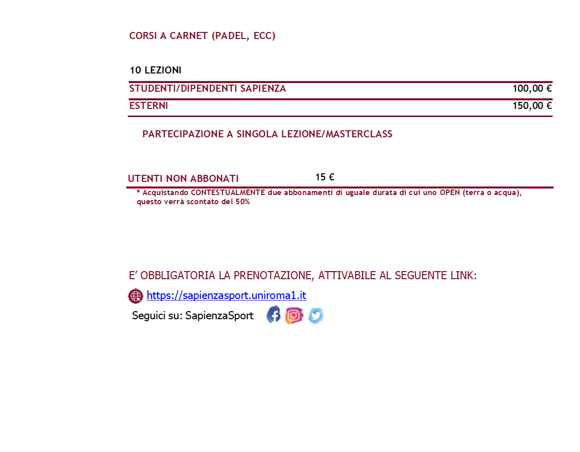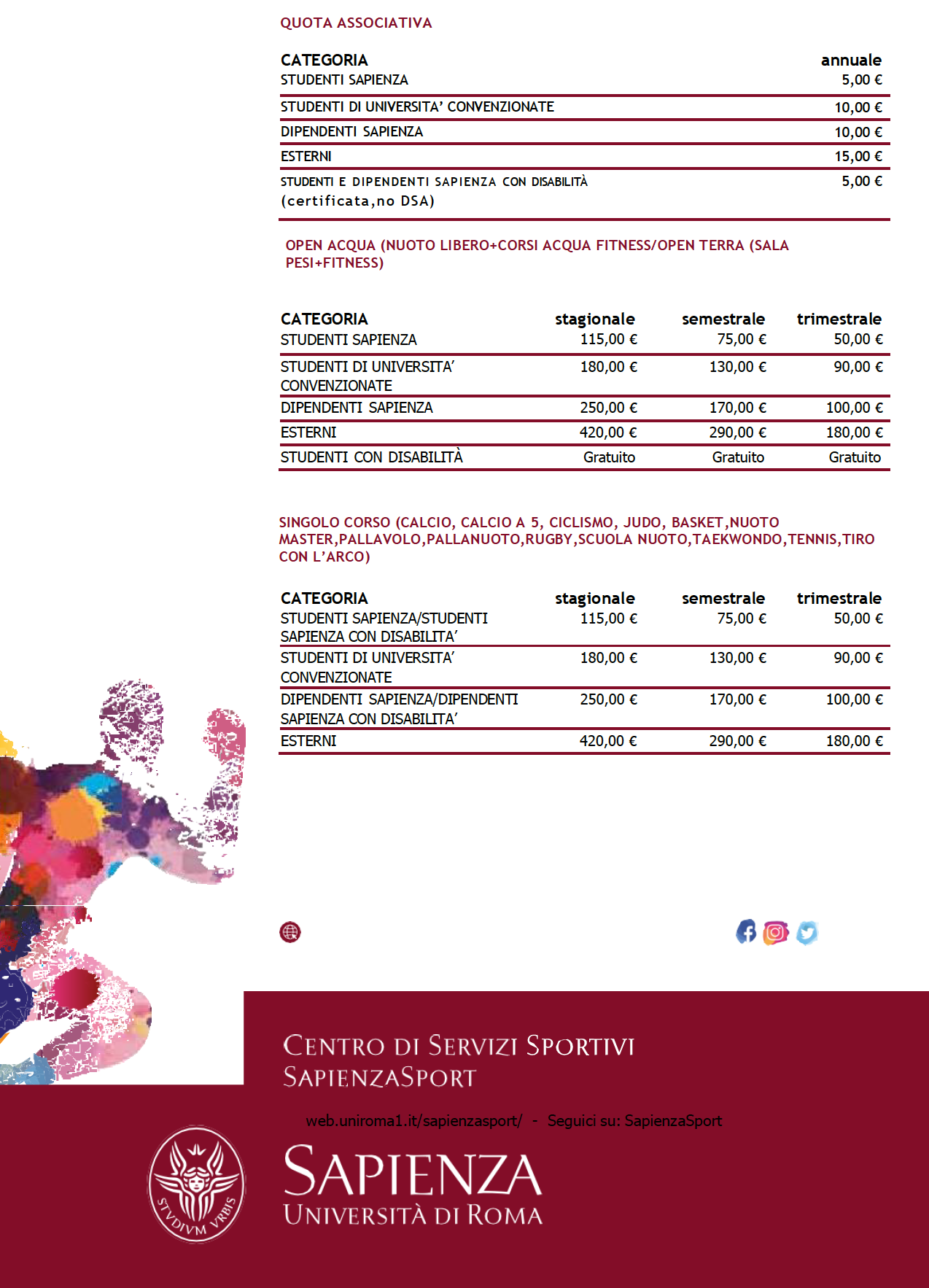 Per frequentare gli impianti è necessario essere associati a SapienzaSport, e sottoscrivere un abbonamento secondo le tariffe approvate dal CdA del giugno 2023.